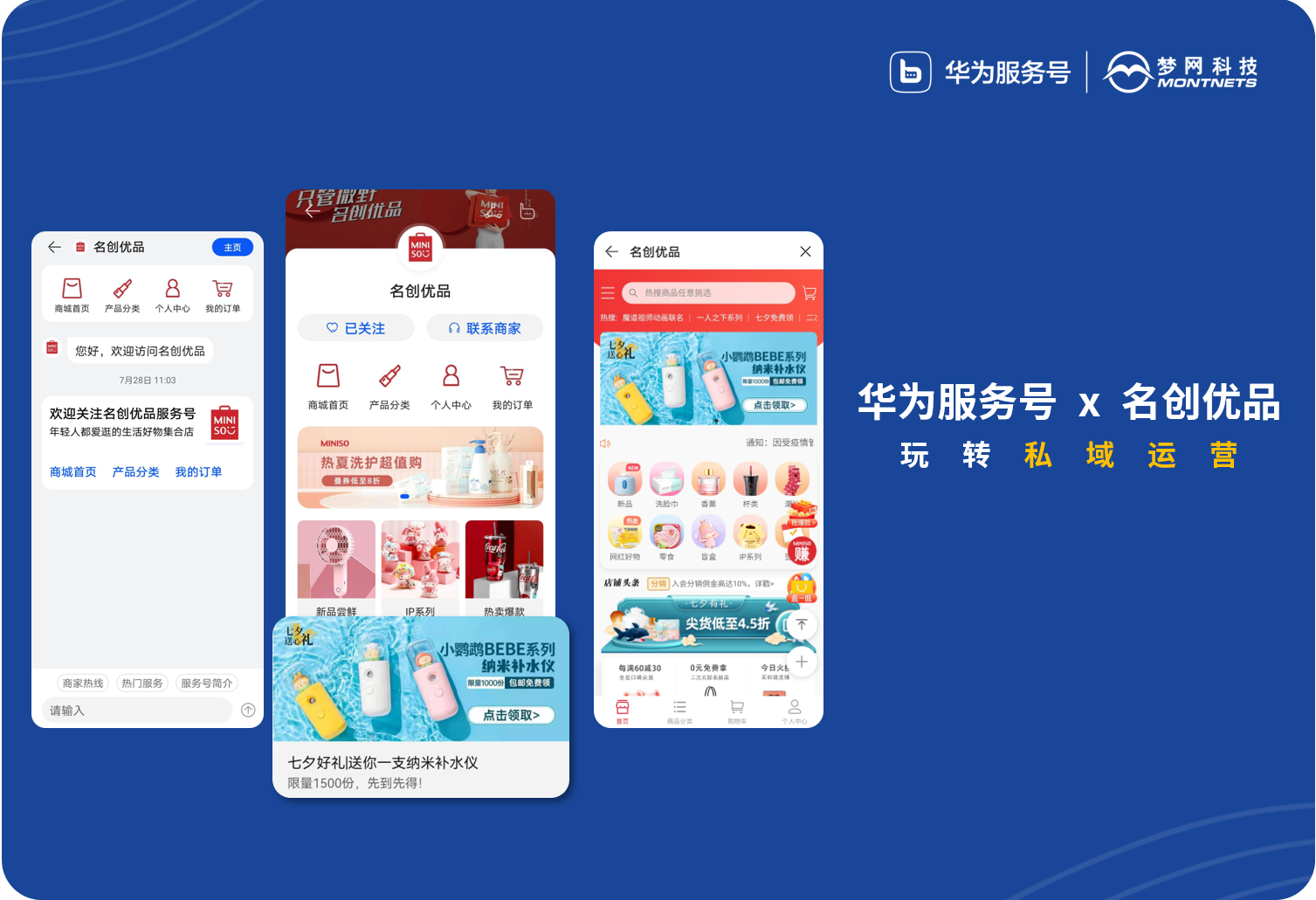 20215月,名创优品入驻华为服务号,有效利用活动营销、客服导购及服务通知等核心能力,顺利获得品牌专题曝光、活动策划及消息服务推送三大方向,实行用户运营,实现私域流量的精细化运营,有助于线上数字化营销布局进程。