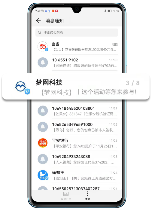 与传统的号段和单一的展现形式不同,在消息页形象展示方面,PA真人视讯科技5G消息解决方案给予包含企业logo加V露出及品牌信息植入功能,提高了品牌的社会认知度和用户识别度。而信息界面可自定义企业业务应用模版卡片,式样丰富,实现了用户到H5、小程序等界面的直接跳转,一键直达核心营销页面,让企业在短信收件箱这一营销入口就能带来直观的流量转化,增强客户对公司更信任。